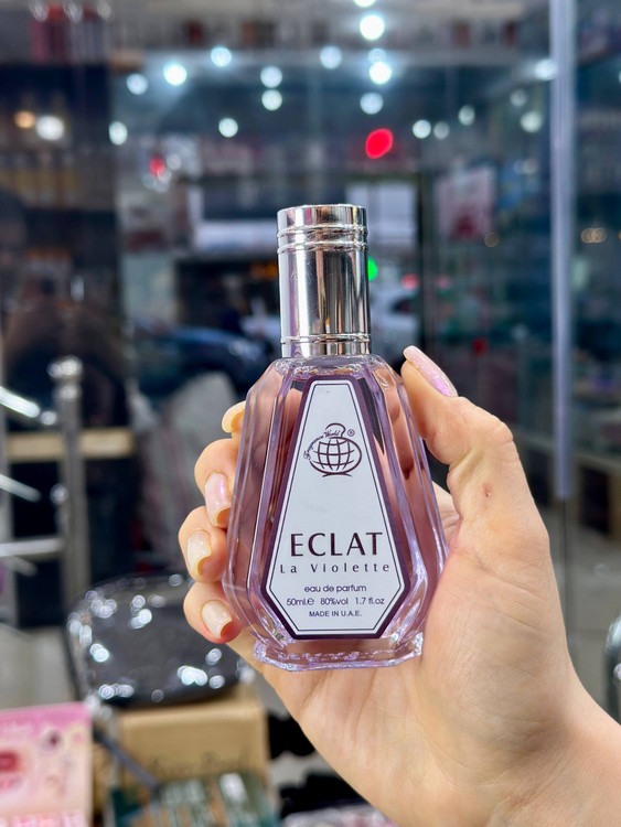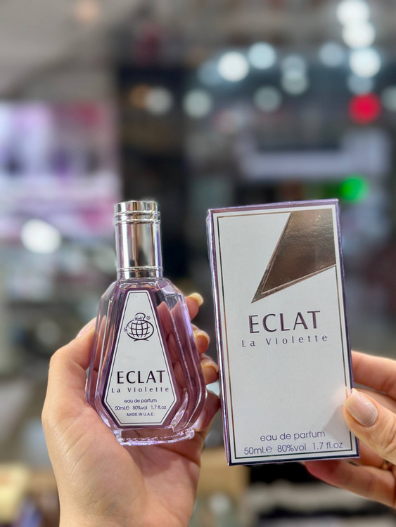 ادکلن 50 میل فراگرنس ورد اکلت لا ویولت رایحه لانویت اکلت محصول برند اماراتی شناخته شده فراگرنس ورد است. عطر ادکلن اکلت با ساختار مرکبات و رایحه ای خنک و شیرین برای روزهای بهاری و تابستانی مناسب می باشد. عطر زنانه لانویت اکلت ECLAT La Violette به دور شیشه ی خود گردنبندی دارد که در نگاه اول توجه بیننده را به خود جلب می کند. این گردنبند با نگینی به شکل قلب هدیه ای برای طرفداران و خریداران این ادو پرفیوم زنانه می باشد.